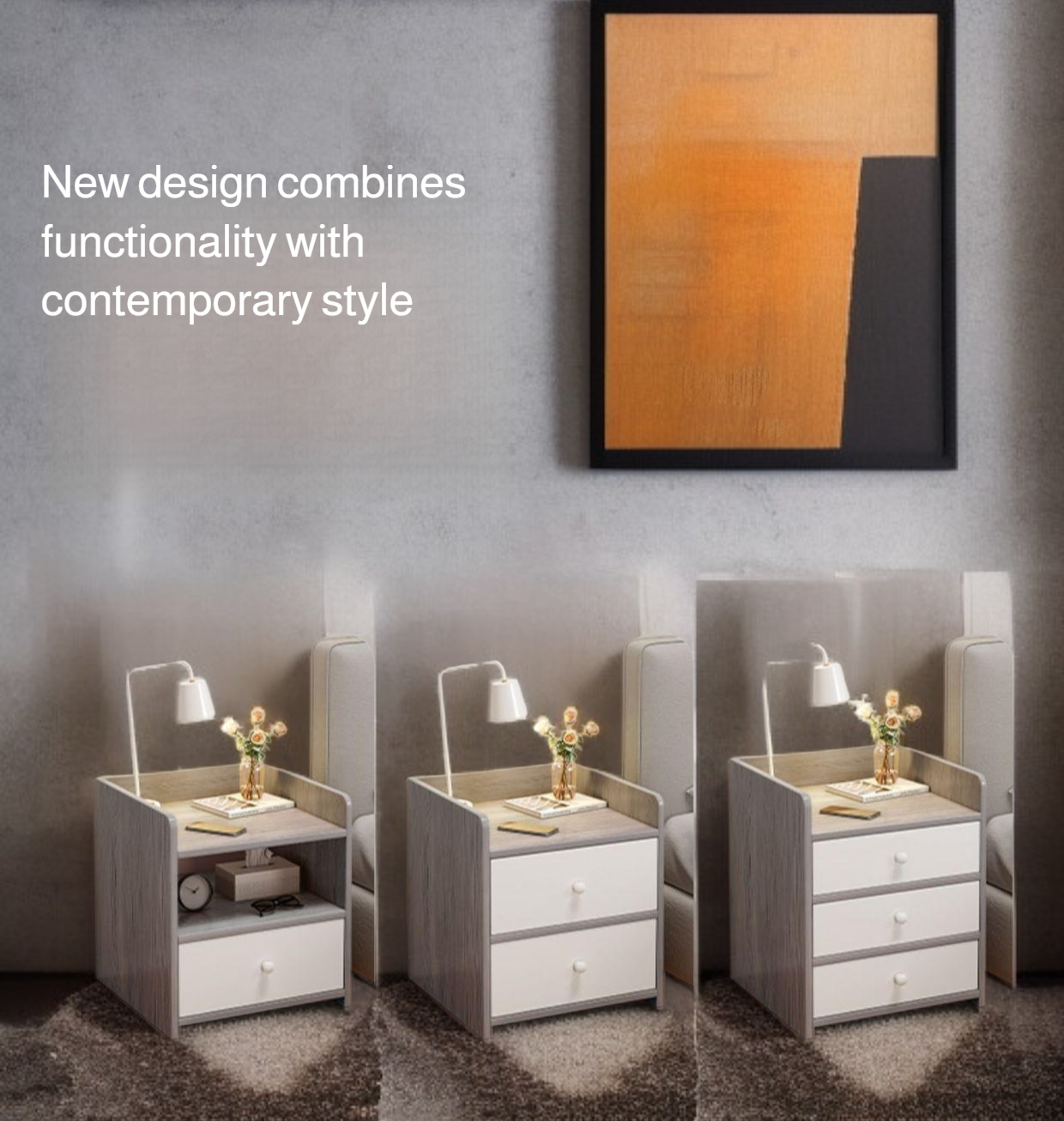 Space-saving design, durable materials, easy assembly, versatile storage, complements modern bedrooms, smooth surface for easy cleaning, neutral color fits various décor styles.